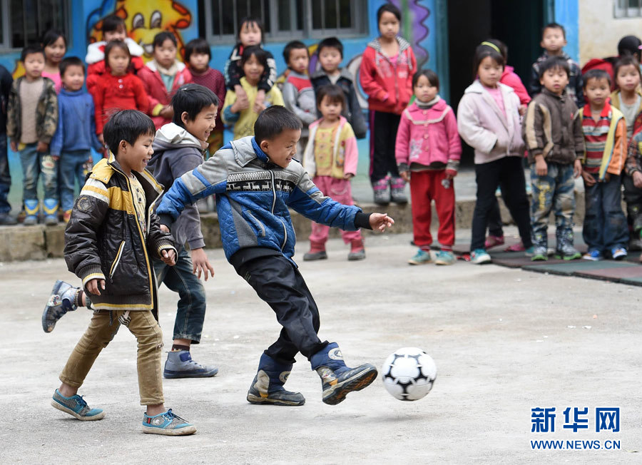 在广西大化瑶族自治县板升乡弄雷小学,学生们在踢足球(12月9日摄)。在广西大石山区,因受经济发展、自然环境、师资力量等条件制约,这里的部分山村学校体育教育严重“短腿”。然而,尽管条件艰苦,缺乏体育设施,没有专业老师指导,但孩子们利用山旮旯里的狭小空间,打篮球、耍足球、打乒乓球、跳绳……在童年里感受体育运动带给他们的乐趣。据悉,广西教育部门正采取多项举措,计划在未来几年改变大石山区农村小学基本办学条件薄弱的现状。在这一轮“改薄工程”中,广西正在把学校体育场地建设和设施器材配备纳入计划中,改善贫困山区孩子们的活动场所,圆山旮旯孩童们的“体育梦”。新华社记者 张爱林 摄