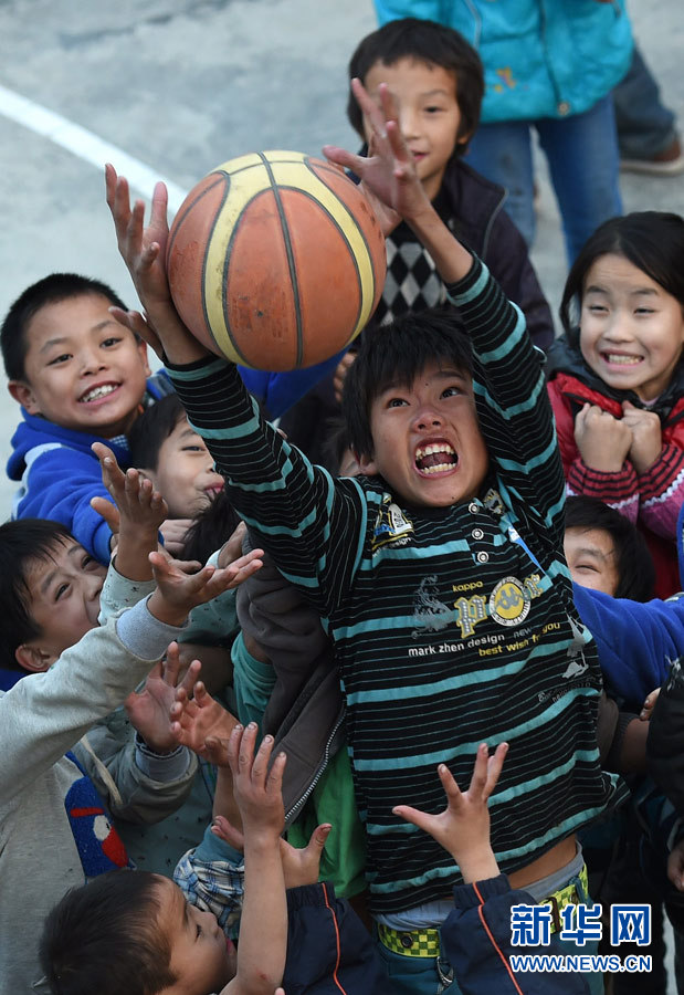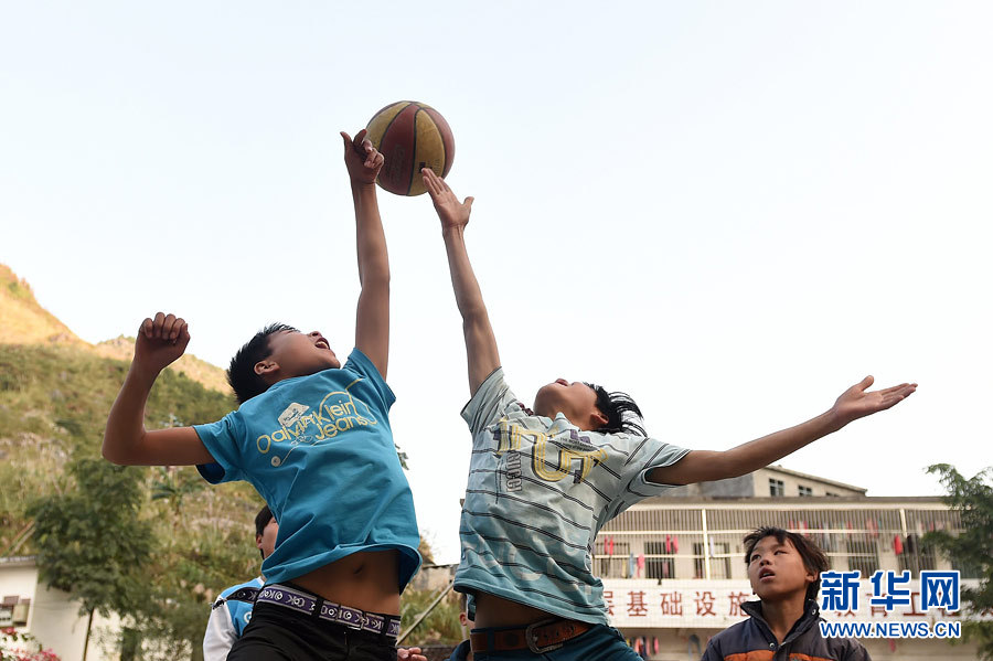 在广西大化瑶族自治县板升乡八好小学,学生们在打篮球(12月8日摄)。