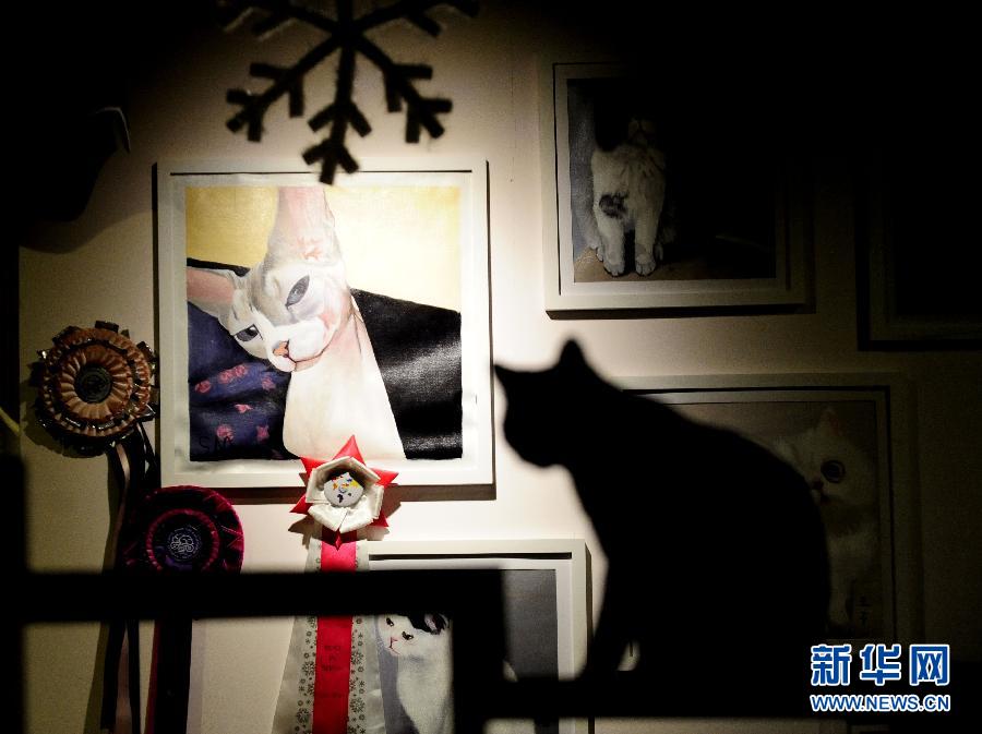 12月9日,在沈阳“星猫咖啡店”,一只小猫注视着墙上关于猫咪的绘画作品。