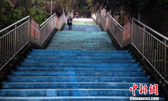 近日,重庆西南大学两位即将毕业的大学生,花了近10小时时间,把行走了4年,原本青灰的石梯涂鸦上了蓝色、绿色和红色的油漆,这条153级的石梯化身了“彩虹梯”。 李裔铭 摄