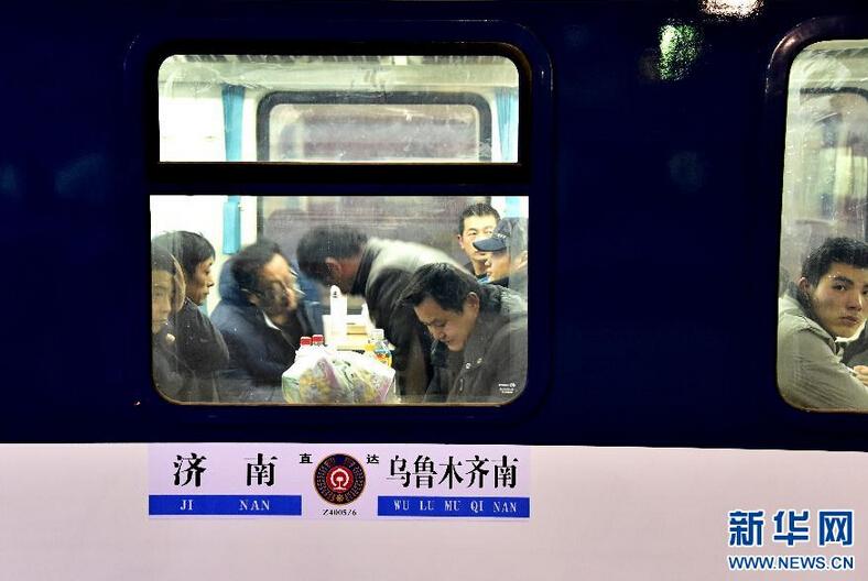 12月9日,在济南火车站,乘客准备登上Z4005/6次列车。当日21时58分,首趟往返于济南与乌鲁木齐间的直达特快列车Z4005/6次列车从山东济南火车站发车,该车运行时间为40小时01分,比原来两城市之间火车的运行时间缩短了8小时35分。新华社记者 徐速绘 摄