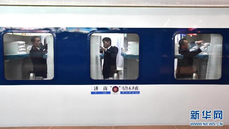 12月9日,在济南火车站,乘客准备登上Z4005/6次列车。当日21时58分,首趟往返于济南与乌鲁木齐间的直达特快列车Z4005/6次列车从山东济南火车站发车,该车运行时间为40小时01分,比原来两城市之间火车的运行时间缩短了8小时35分。新华社记者 徐速绘 摄