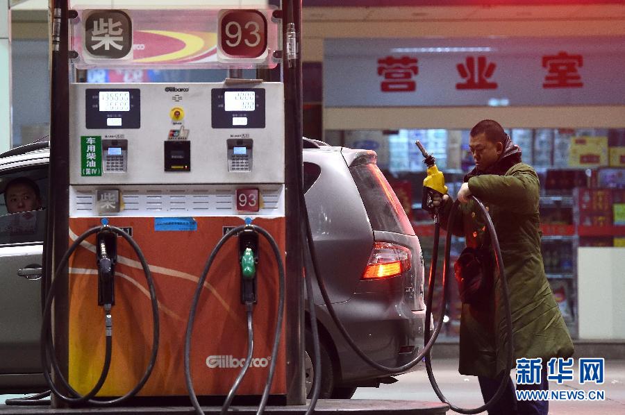 12月12日夜间,太原市一加油站中,工作人员正在为一辆汽车加油。国家发展改革委发出通知,决定将汽、柴油价格每吨分别降低170元和400元,调价执行时间为12月12日24时。 新华社记者范敏达摄