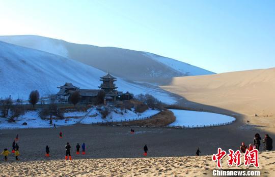 一场冬雪过后的甘肃敦煌著名旅游景点鸣沙山月牙泉景区被白雪覆盖,不少游客在刚刚过去的这个周末专程来此欣赏大漠雪景。敦煌市旅游局最新统计数据显示,截至今年11月底,敦煌市旅游接待人数达497.6万人次,同比增长25.48%;实现旅游收入47.19亿元,同比增长28.23%。旅游综合效益再创历史新高。