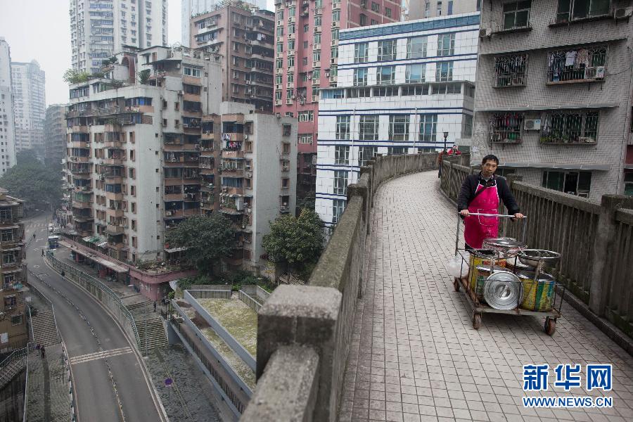 12月15日,一位市民在“任性”天桥上行走。重庆是一座山城,地势落差比较大,有许多独特的公共设施方便市民出行。在重庆市渝中区有一座天桥,一端连着大阳沟派出所一侧的地面,另一端与鑫龙花园A栋13楼相接,被许多网友戏称为“任性”天桥。天桥宽约2米,长约30米,距地面最大距离约40米,尽显重庆“3D魔幻立体”的城市特色。新华社记者 孟涛摄
