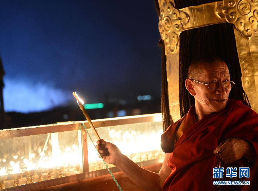12月16日晚,拉萨大昭寺的一位僧人在屋顶点燃酥油灯。