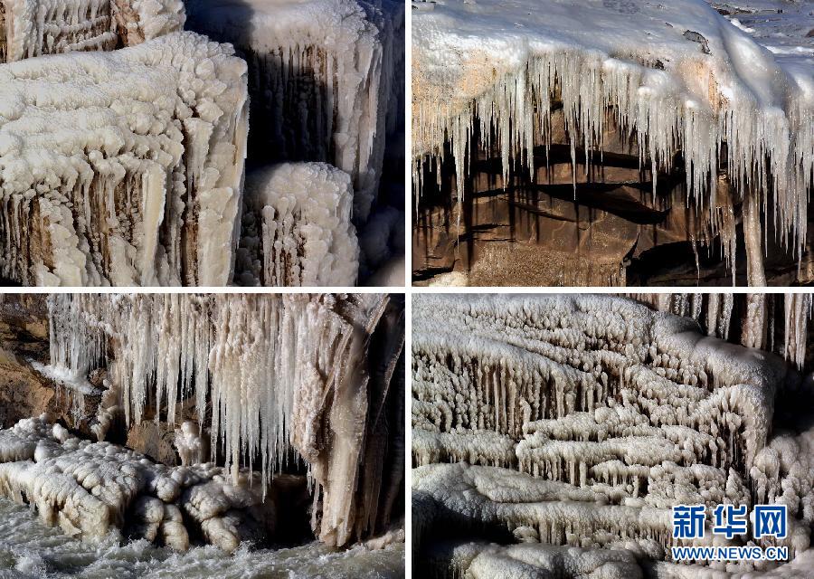 壶口瀑布景区河道两岸悬挂着的各种形状的“冰瀑玉壶”(12月16日摄,拼版照片)。进入12月以来,由于受持续降温天气影响,地处晋陕交界的黄河壶口瀑布出现“冰瀑玉壶”景观。往日飞瀑高悬处挂满巨大的冰柱,一条条冰挂垂于崖壁之上,曾经咆哮奔腾的河道凝结成洁白的“玉带”,吸引了大批游客和摄影爱好者来此赏景、创作,感受冬日里的别样风情。新华社记者王颂摄