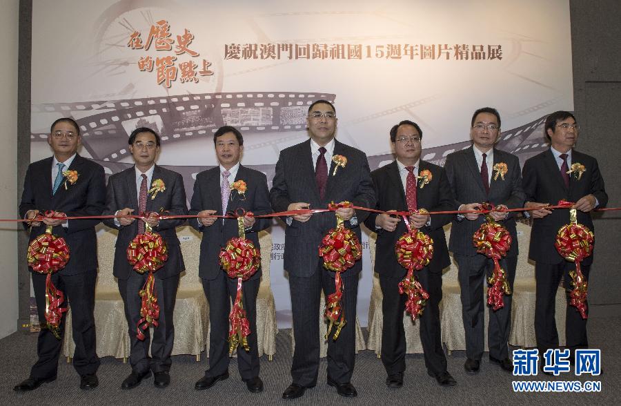12月16日,澳门特区行政长官崔世安(中)、中央人民政府驻澳门联络办公室副主任陈斯喜(左三)、外交部驻澳门特派员公署副特派员潘云东(右三)和新华社亚太总分社社长俱孟军(左二)等嘉宾共同为图片展开幕剪彩。当日,在澳门回归祖国15周年之际,新华社新闻图片展《在历史的节点上——庆祝澳门回归祖国15周年图片精品展》在澳门举行。约100个精彩瞬间记录了回归祖国以来澳门“一国两制”实践的成功经验,以及经济发展和社会进步的伟大成就。新华社记者何靖嘉摄