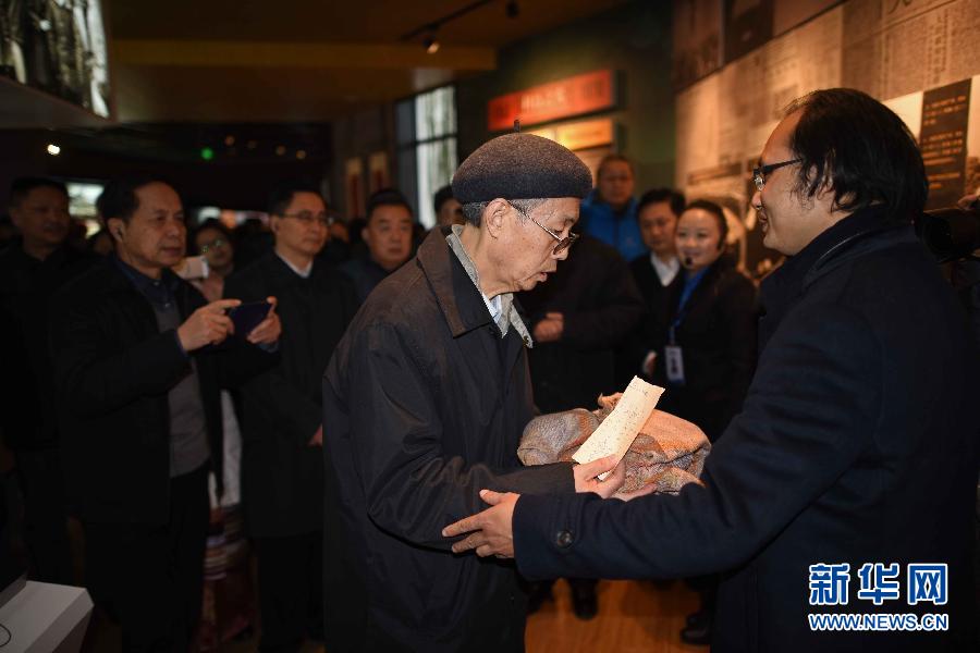 12月16日,范长江之子范苏苏(中)向重新开放的范长江故居捐赠范长江的遗物。当日,在四川省内江市东兴区,新中国新闻事业奠基人范长江故居经过改陈布展后重新对外免费开放。范长江故居于2009年范长江100周年诞辰之际落成开馆,2013年8月闭馆改陈布展。 新华社记者 薛玉斌 摄