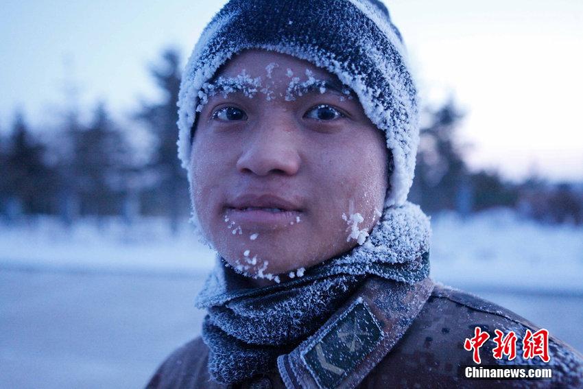 2014年12月16日,黑龙江省黑河市,黑龙江省军区某边防团机动步兵连官兵冒着零下30多度严寒气温进行体能训练,挑战极寒,锻造钢筋铁骨,锤炼过硬意志品志。该连素有“世界冠军的摇篮”之称,曾有5人24人次登上世界军事五项冠军的领奖台。新时期,他们将“拼搏进取、勇争第一”的冠军精神融入到建连育人之中,连队建设不断迈上新台阶。
