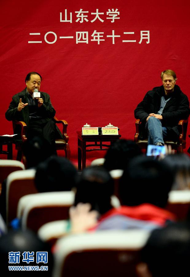 12月16日,莫言(左)与法国诺贝尔文学奖获得者勒克莱齐奥出席山东大学“文学大讲堂”活动。当日,山东大学“文学大讲堂”第三期邀请了中法两国诺贝尔文学奖获得者莫言与勒克莱齐奥齐聚一堂,畅谈“文学与人生”。 新华社发(赵晓明摄)