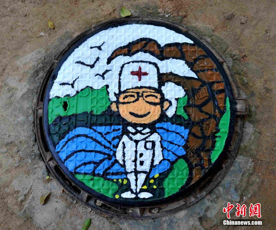 12月16日,在福州福建省肿瘤医院窨井盖上,一幅幅由医护人员绘制,惟妙惟肖的“井盖画”,吸引了许多过往病人和家属的眼球。多彩的井盖,不仅可以让医务工作者和病人放松了心情,也创造一个和谐温馨的康复环境。张斌 摄