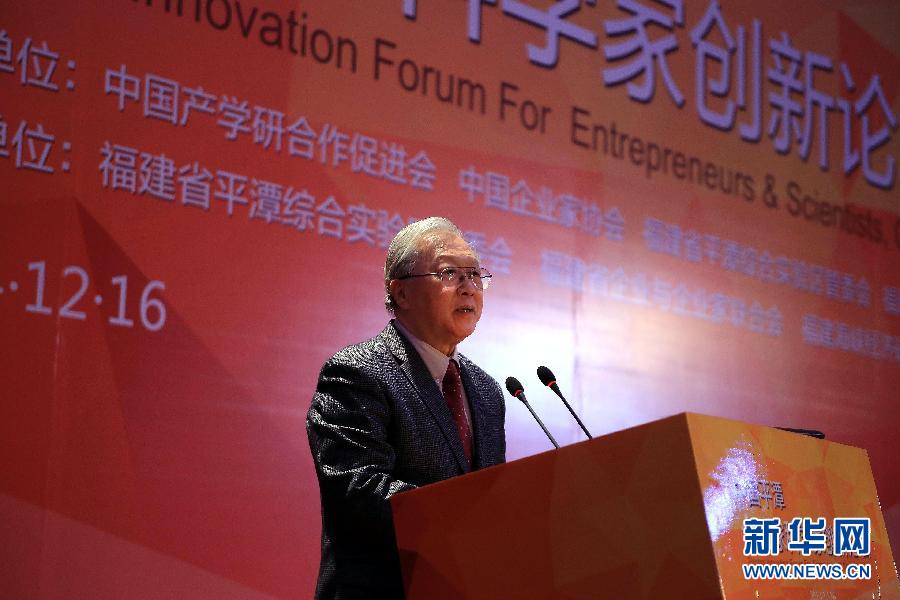 12月16日,中国产学研合作促进会会长路甬祥发表《实施创新驱动战略 探索创新驱动——企业家科学家的历史机遇与使命》主题演讲。当日,由中国产学研合作促进会、中国企业家协会等机构主办的中国平潭·企业家科学家创新论坛在福建平潭开幕。 新华社发(张燕辉摄)