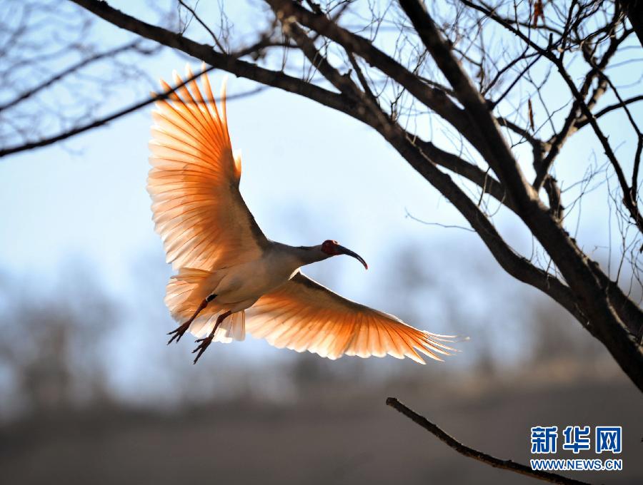 12月16日,朱鹮飞翔在陕西省铜川市耀州区柳林林场。