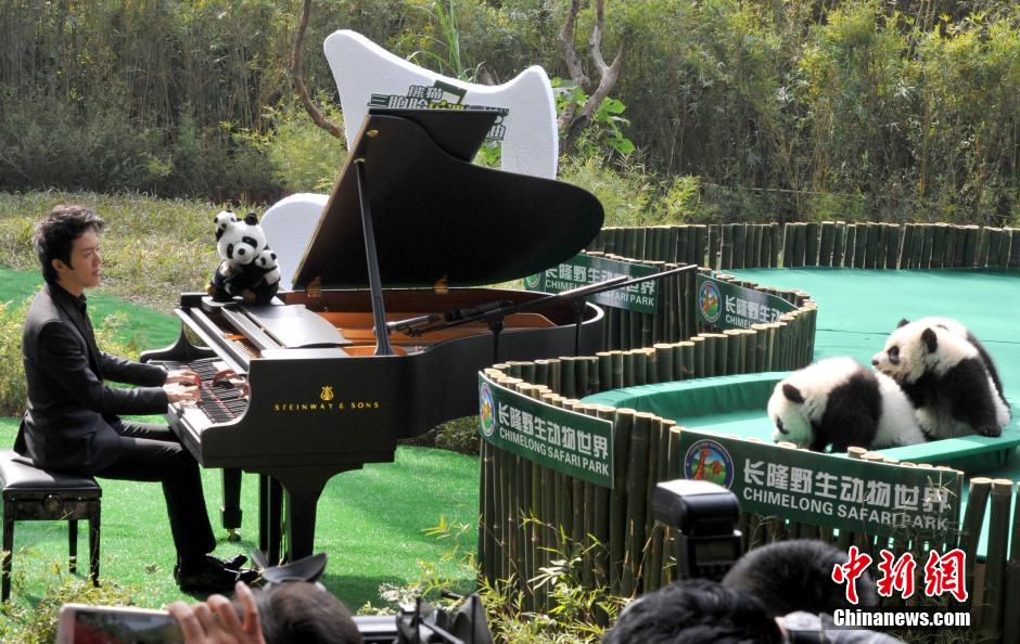 12月15日,“熊猫三胞胎乐遇李云迪”主题活动在广州长隆野生动物世界大熊猫中心举行,并宣布了大熊猫三胞胎的名字,大姐叫萌萌,二弟叫帅帅,三弟叫酷酷。钢琴男神李云迪现场为全球唯一的大熊猫三胞胎倾情演奏了曲目:《肖邦夜曲》和《彩云追月》,以送上特意为它们三个准备的祝福。中新社发 刘卫勇 摄