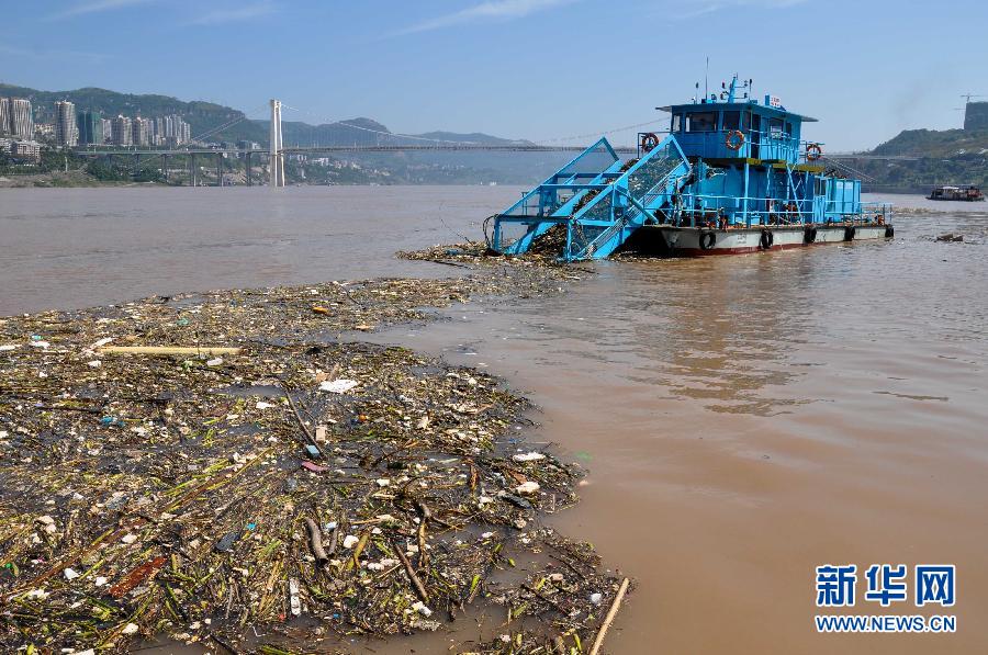 重庆万州区清漂队的新型全机械化清漂船在长江上进行清漂作业(9月22日摄)。三峡工程蓄水过后,往日奔流不息的滔滔长江化作高峡平湖,一碧万顷。然而,这一池碧水,是靠一群人十年如一日默默无闻奉献换来的。他们驾着小船,用竹竿撑着网兜,不分早晚,无论寒暑,在江面上清理漂浮的垃圾。这就是三峡库区的清漂队。新华社发
