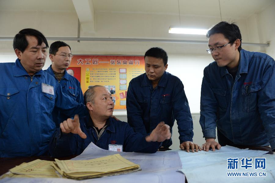 12月13日,“大工匠”张东亮(中)在以其名字命名的工作室和工人进行技术交流。位于河南洛阳的中信重工机械股份有限公司于2013年9月推出“大工匠 ”制度,首批聘任5名“大工匠”。据介绍,“大工匠”是中信重工实施的“金蓝领工程”中的顶尖高技能领军人才,在企业生产制造中发挥着克难攻关、言传身教、示范带头等重要作用。聘任“大工匠”,在为企业培养高素质、高技能的技术工人队伍的同时,也为技术工人搭建新的成长通道,为基层员工提供实现梦想的新平台。新华社记者 王建华 摄