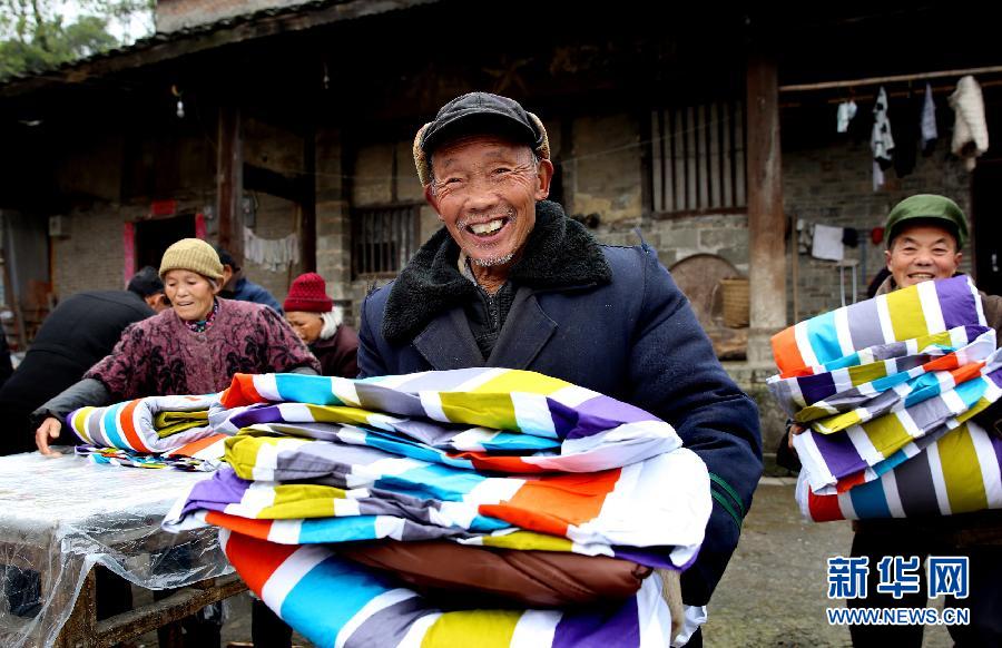12月14日,四川省广安市前锋区桂兴镇联丰村的贫困群众领到棉被、棉衣等保暖物品。