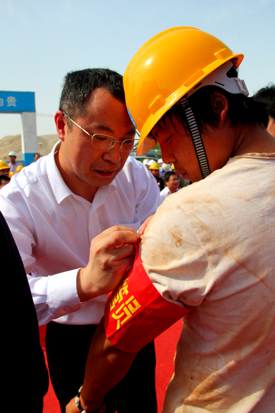 土木公司江西分公司党总支书记朱泽民为农民工安全监督员佩带袖章