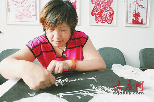 说话间,梁淑英拿起自己处理好的鱼骨,轻轻点上502胶水,粘布底子上,不一会儿,一颗小树就呈现在大家面前。