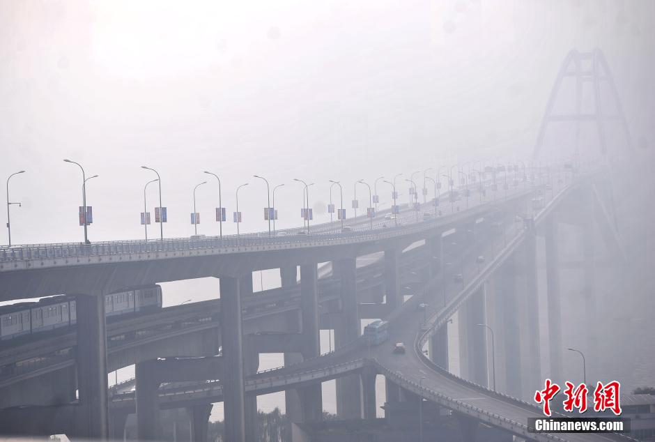 12月19日,重庆市气象台10时30分发布“霾黄色预警”。预计从12月19日10时30分到20日20时,重庆市渝中区、江北区、渝北区、南岸区、九龙坡区、大渡口区、沙坪坝区、北碚区和巴南区将出现能见度小于3000米的霾,提醒各地市民注意预防霾可能造成的危害。图为重庆菜园坝大桥隐隐约约。 陈超 摄