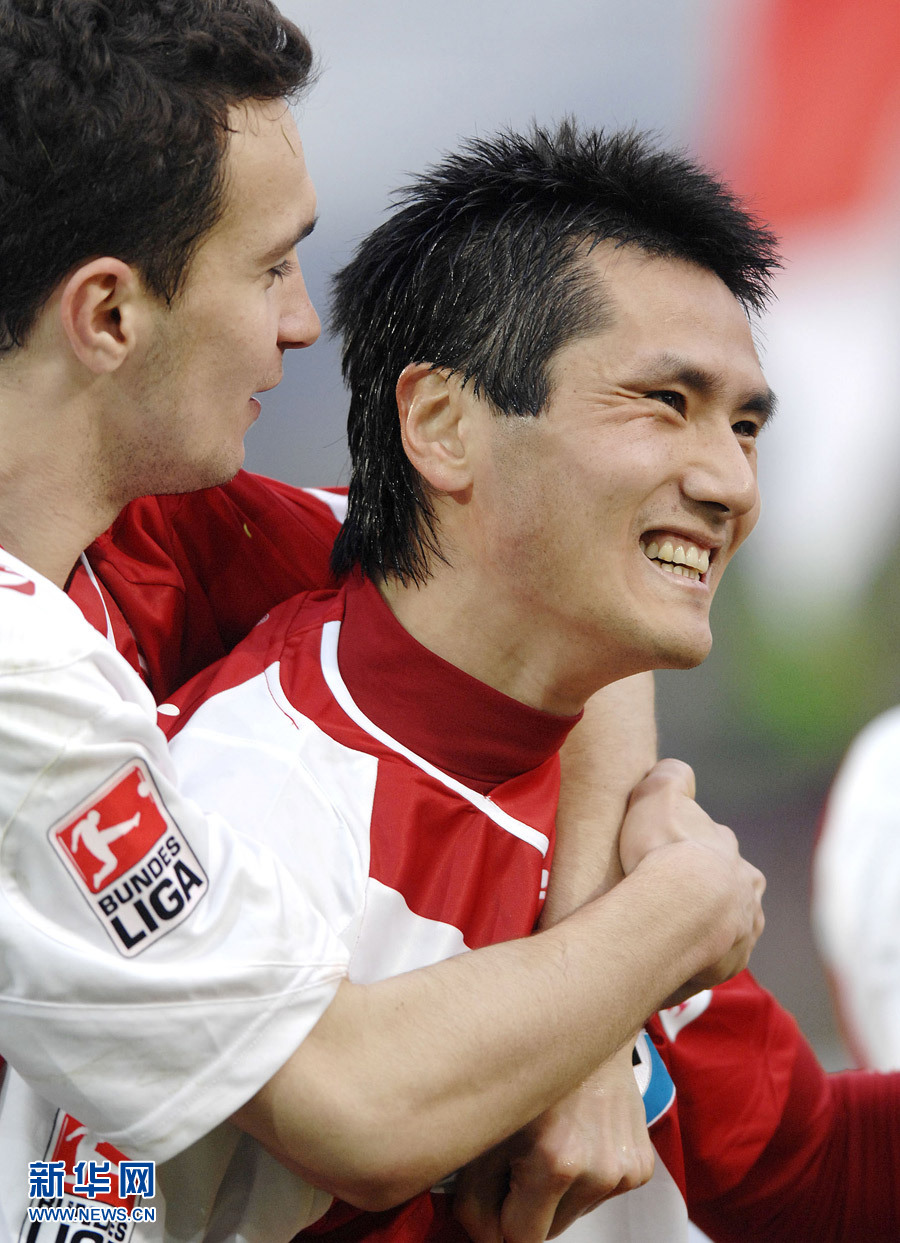 图为2008年3月15日,效力德甲科特布斯队的邵佳一(右)与队友庆贺一场联赛比赛的胜利。邵佳一是目前为止在德出场场次最多和进球最多的中国球员。在德期间出场168次,打进24粒进球。 新华社记者吴晓凌摄