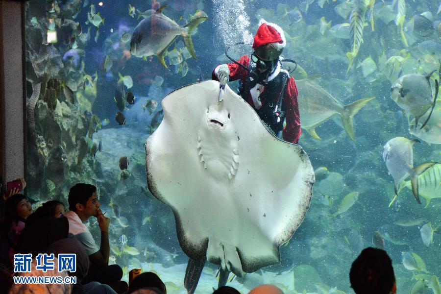 12月19日,在马来西亚吉隆坡,打扮成“圣诞老人”的潜水员为魔鬼鱼喂食。当日,为迎接圣诞节,马来西亚吉隆坡水族馆安排两名潜水员打扮成“圣诞老人”在水底为鱼群喂食,吸引游客观看。活动将持续至12月31日。新华社发(张纹综摄)