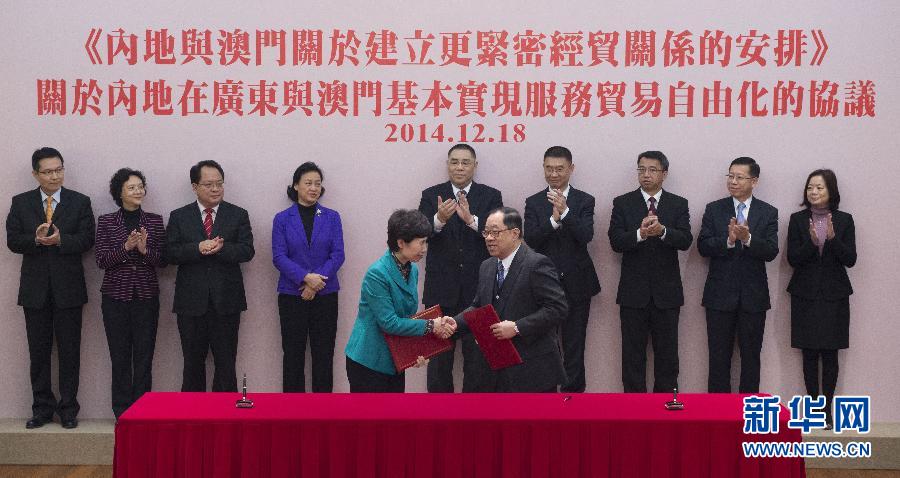 12月18日,商务部副部长高燕(前左)与澳门特区经济财政司司长谭伯源(前右)在签约仪式上。当日,《关于内地在广东与澳门基本实现服务贸易自由化的协议》在澳门签署,协议将在2015年3月1日起正式实施。 新华社记者 吕小炜 摄