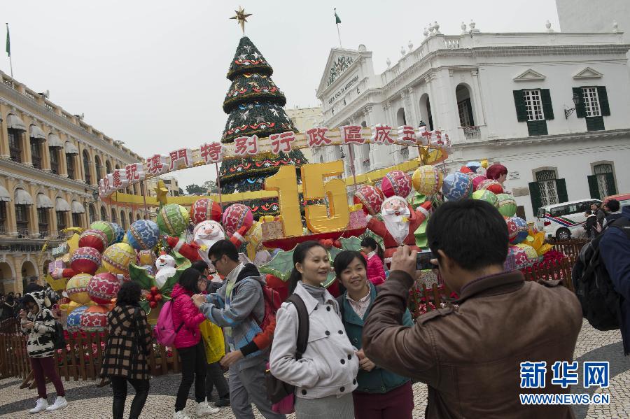 12月18日,游客在澳门议事亭前地庆祝澳门回归15周年的装饰前留影。 随着澳门回归15周年庆祝活动临近,澳门街头庆祝回归的气氛渐浓。新华社记者 秦晴 摄