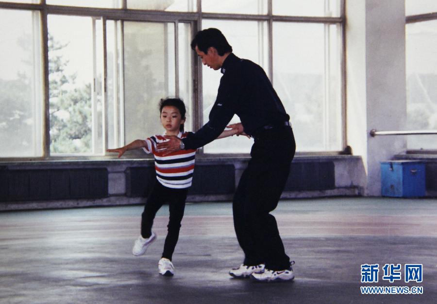 年幼的李子君在教练的指导下练习花样滑冰动作(2003年摄)。 新华社发