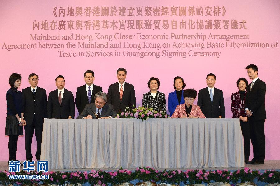 12月18日,香港特区政府财政司司长曾俊华(前左)与商务部副部长高燕(前右)签署协议。当日,《关于内地在广东与香港基本实现服务贸易自由化的协议》在港签署,《协议》即日生效并在2015年3月1日实施。 新华社发