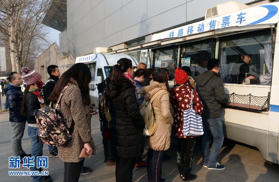 12月18日,学生在北京邮电大学校园内的流动售票车前排队买票。为方便高校学生取票,北京铁路局开出流动售票车深入部分校园,为学生提供送票上门服务。学生也可就近选择车站窗口、自助售票机、火车票代售点付款取票。据了解,北京铁路局集中优先为大学生办理2015年1月15日至2月10日期间的往程学生团体票和2015年3月1日至3月15日期间的返程学生团体票,确保大学生能及时回家和返校。北京铁路局今年集中受理大学生订票约2.1万张,首次采取学校集中办理,学生分散单独取票的方式。从2014年12月16日8时到12月22日20时,学生均可自主确认支付和取票时间。新华社记者 陈晔华 摄