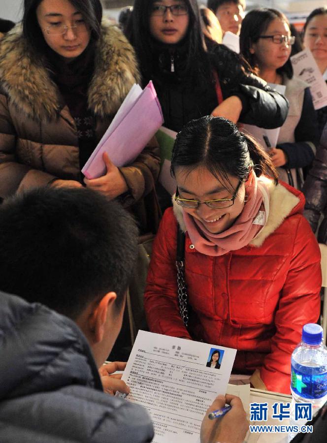 12月18日,应聘者在接受面试。当日,2015年北京地区毕业研究生专场供需见面、双向选择招聘会在中国国际展览中心开幕,730家用人单位提供了1.8万个就业岗位。新华社记者 李文摄