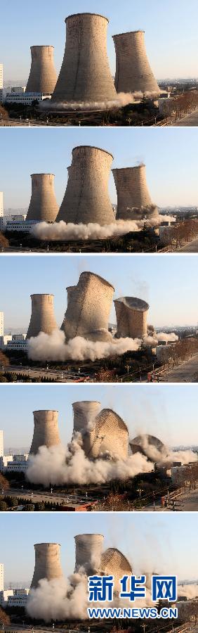 12月17日,地处山东枣庄闹市区的两座90米高的电厂冷却塔被爆破拆除(拼版图片)。这两座冷却塔始建于1978年,整体为双曲线型,后为响应国家节能减排号召而停止使用。目前,因塔体存在一定的安全隐患被爆破拆除。新华社发(孙中喆 摄)