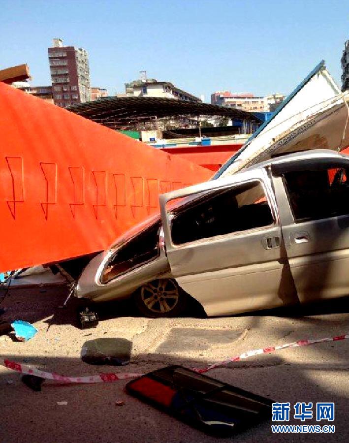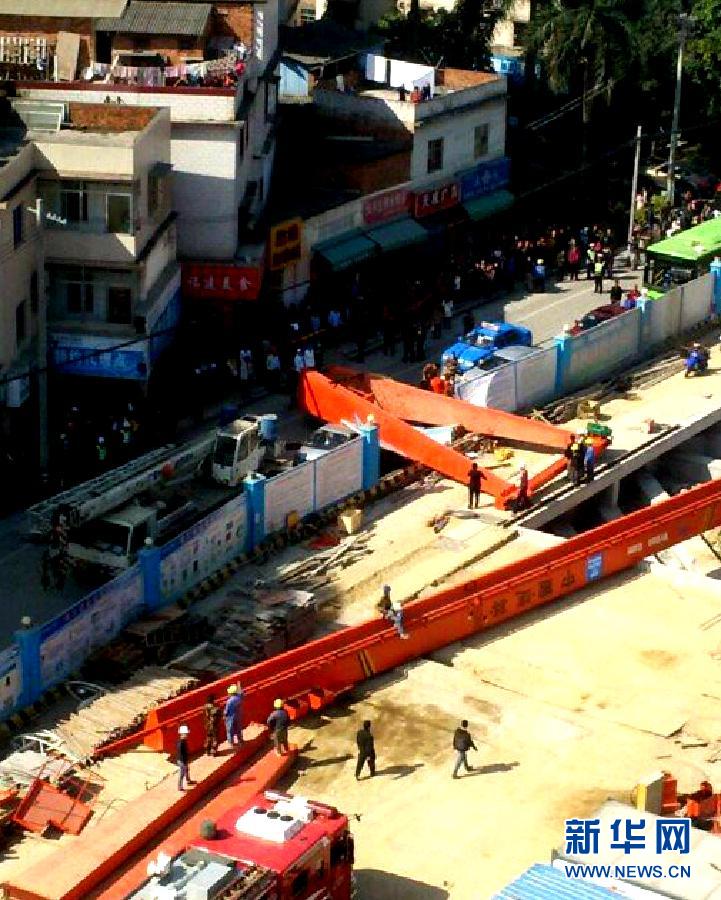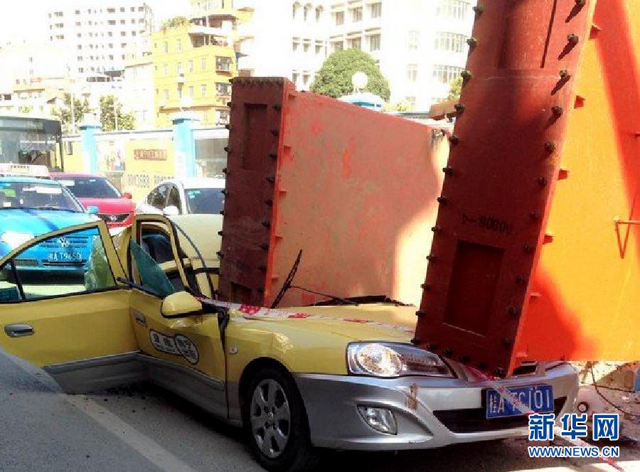 12月18日拍摄的南宁打桩机倒塌事故现场(手机拍摄)。当日12时许,广西南宁一地铁施工点的打桩机横倒,压毁一辆出租车和一辆面包车。面包车司机在车辆被砸后成功逃出,出租车司机被困。经交警、消防等部门联合救援,出租车司机受伤获救,已被送往医院进行治疗。14时许,事故地点周边道路经疏导已恢复畅通。事故原因正在调查中。新华社发