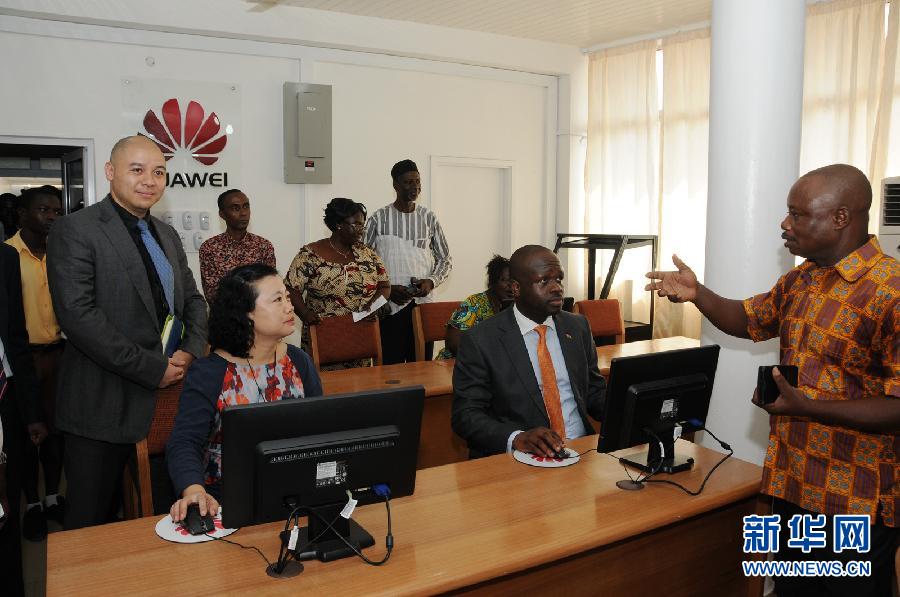 12月17日,在加纳首都阿克拉,中国驻加纳大使孙保红(左二)、加纳通信部长爱德华·博阿玛(右二)、华为技术有限公司加纳分公司总经理徐虎(左一)在电子阅览室试用崭新的台式电脑。