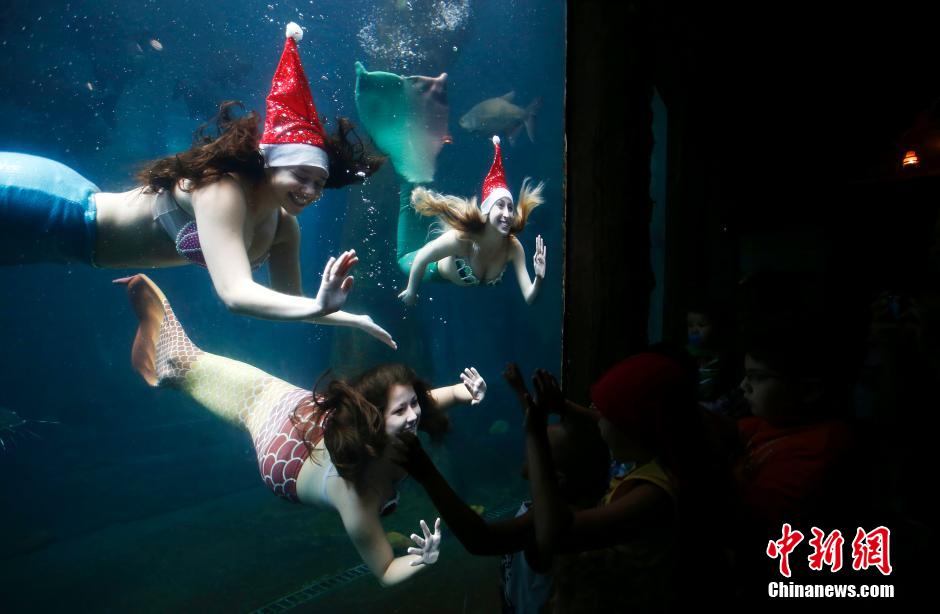 头戴圣诞老人帽的“美人鱼”在水下向游客们打招呼。