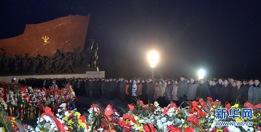 朝中社12月17日提供的照片显示,朝鲜民众16日来到位于平壤万寿台广场的金日成、金正日铜像前鞠躬、献花,纪念金正日逝世三周年。金正日于2011年12月17日因病逝世。新华社/朝中社