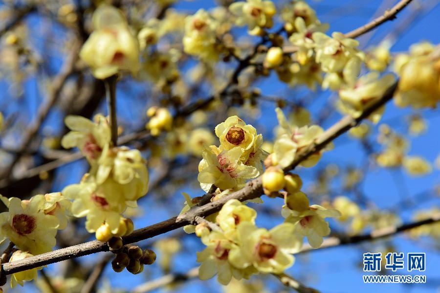 12月17日在湖北省保康县腊梅公园拍摄的腊梅。初冬时节,素有“腊梅王国”之称的湖北省保康县6万多亩野生腊梅竞相绽放,吸引了各地游客前来观赏。 新华社发(杨韬 摄)