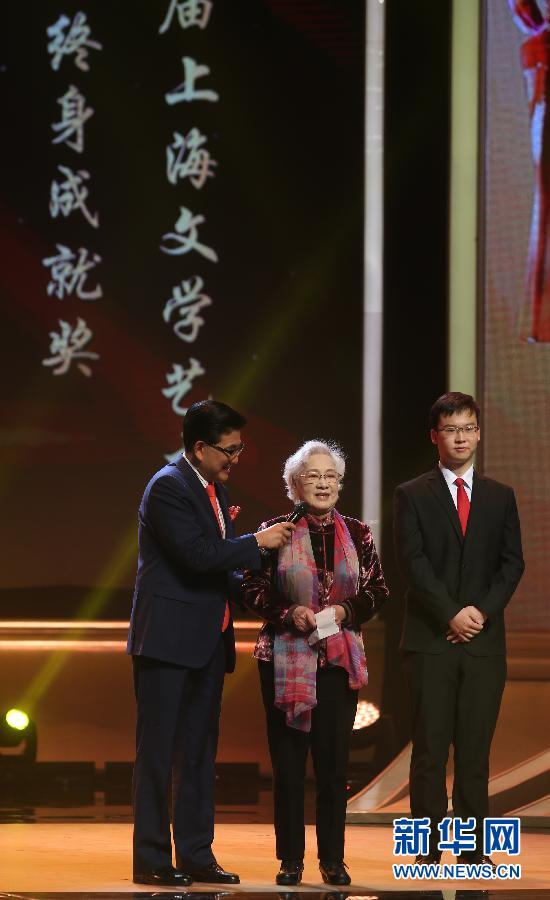当日,第六届上海文学艺术奖在上海大剧院举行颁奖礼。在文学、影视、音乐舞蹈、戏剧、美术等五大领域,共有12位文艺大家获承载最高殊荣的“终身成就奖”、12位文艺名家获得“杰出贡献奖”。上海文学艺术奖旨在表彰和奖励为促进和繁荣上海文学艺术事业做出突出贡献的个人与作品,最早设立于1991年。 新华社记者 裴鑫 摄