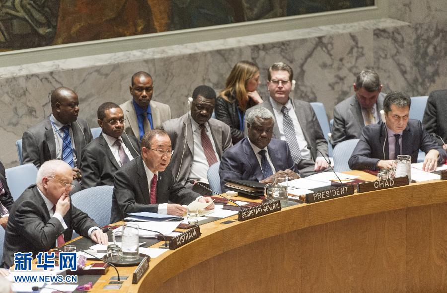 12月16日,联合国秘书长潘基文(前左二)在纽约联合国总部参加安理会会议。潘基文当天强烈谴责巴基斯坦白沙瓦一所学校遭恐怖袭击事件,敦促巴基斯坦政府尽一切努力将袭击者绳之以法。 新华社发
