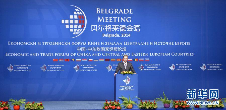 12月16日,在塞尔维亚首都贝尔格莱德,塞尔维亚总理武契奇在论坛上致辞。 当日,中国-中东欧国家第四届经贸论坛在贝尔格莱德举行。新华社记者刘力航摄
