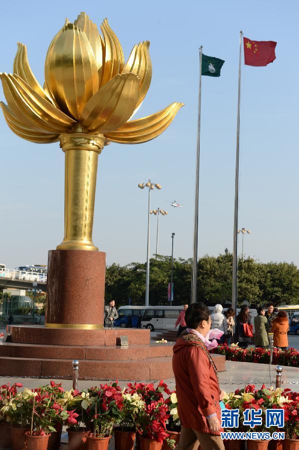 游客从澳门金莲花广场《盛世莲花》雕塑前走过(12月16日摄)。 1999年12月20日,中国政府恢复对澳门行使主权,并成立澳门特别行政区。中央政府向澳门特区送了一尊名为《盛世莲花》的雕塑,分别大、小各一件,寓意澳门继续繁荣昌盛。记者日前专访了《盛世莲花》雕塑的设计者郭宝寨,听他讲述背后的故事。新华社记者秦晴摄