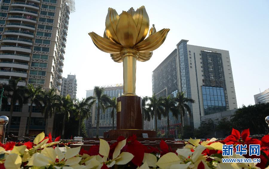 这是澳门金莲花广场上的《盛世莲花》雕塑(12月16日摄)。新华社记者秦晴摄