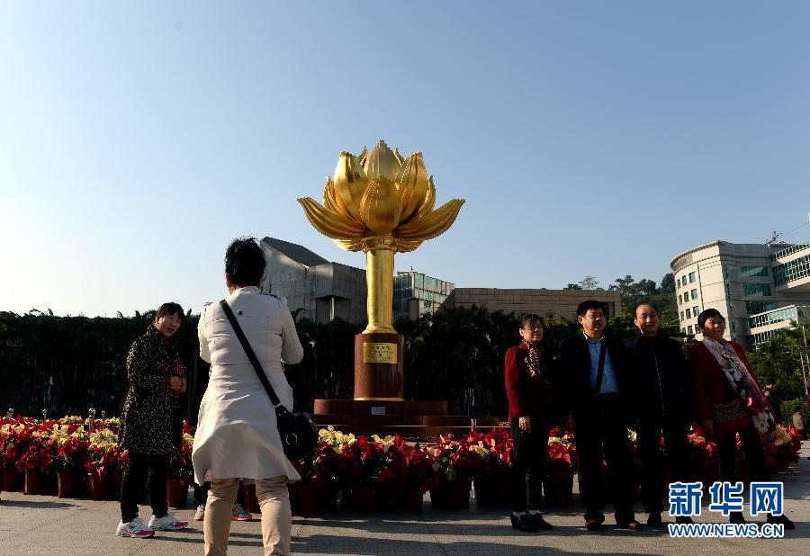 游客在澳门《盛世莲花》雕塑前留影(12月16日摄)。新华社记者秦晴摄