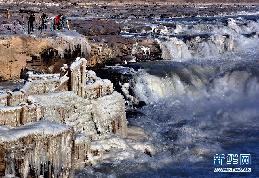 12月16日,几位摄影爱好者在岸上拍摄壶口瀑布冬景。进入12月以来,由于受持续降温天气影响,地处晋陕交界的黄河壶口瀑布出现“冰瀑玉壶”景观。往日飞瀑高悬处挂满巨大的冰柱,一条条冰挂垂于崖壁之上,曾经咆哮奔腾的河道凝结成洁白的“玉带”,吸引了大批游客和摄影爱好者来此赏景、创作,感受冬日里的别样风情。新华社记者王颂摄
