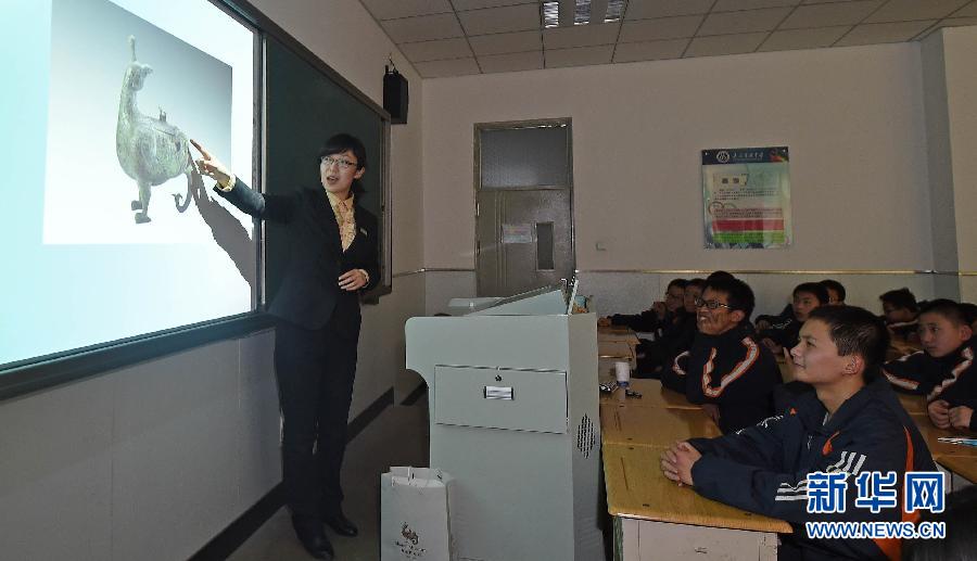 12月16日,在太原市实验中学,山西省博物院社教之家的工作人员在为学生讲解“青铜器上的动物世界”。