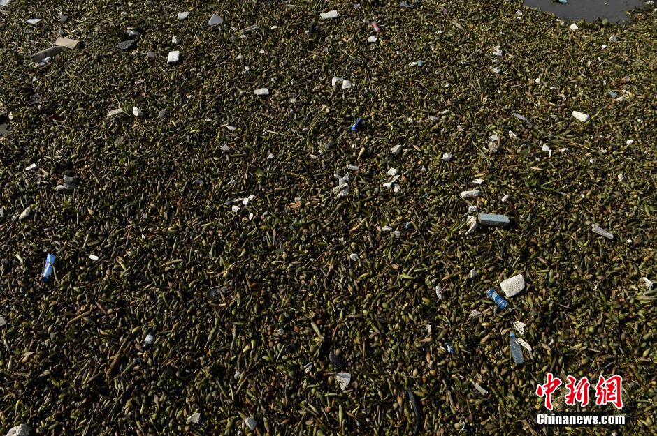 2014年12月16日,上海浦东滨江大道滩涂地带水葫芦上夹杂的生活垃圾。深冬时节,随着黄浦江水位的回落,上海浦东滨江大道段的滩涂上滞留了大面积的水葫芦,水葫芦夹杂着各种饮料瓶、白色泡沫等废弃物形成了壮观的“垃圾带”。中新社发