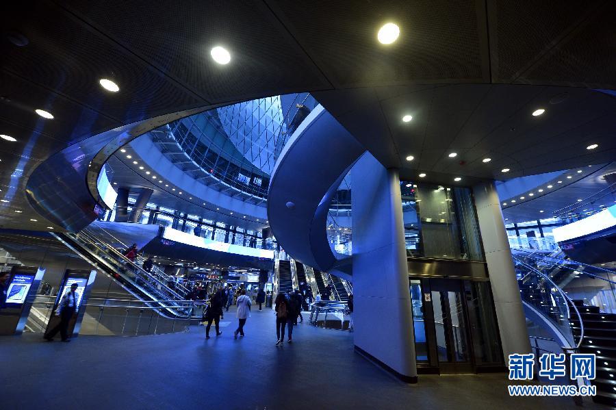 日前新建成投入使用的纽约地铁富尔顿换乘中心是纽约市新建最大的地铁换乘枢纽,拥有27个入口,6.6万平方英尺的零售和商业办公空间,九条地铁线路交汇,每天换乘人数达30万人次,堪称纽约地铁的“中央车站”。该地铁换乘枢纽建设历时10年,耗资14亿美元。地铁站的设计充满现代感,尤其是顶部的穹顶天幕设计,利用自然光和材料反光效果,使车站大厅显得富丽堂皇。新华社记者王雷摄