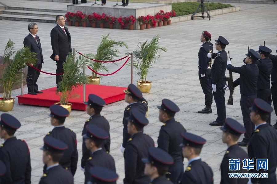 12月20日,澳门特区政府在金莲花广场举行升旗仪式,庆祝澳门回归祖国15周年。这是澳门特区行政长官崔世安(左二)出席升旗仪式。新华社记者吕小炜摄